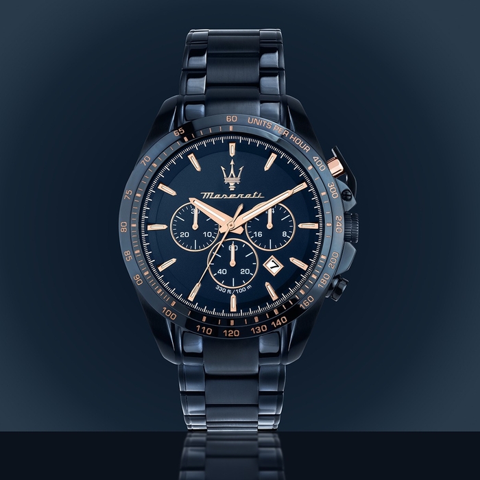 なかでも新登場の「TRAGUARDO(トラガード)」と「VELOCITÀ(ベロチタ)」は、クラシカルなクロノグラフとスポーツスタイルをそれぞれモダンに昇華させた、今季注目の2モデル。マセラティの新たな挑戦を感じさせるラインナップです。