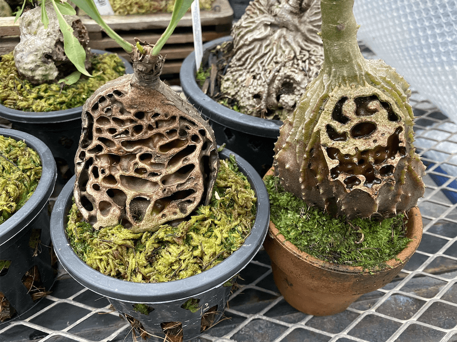 アリを住まわせるために肥大化したり、奇妙にねじれたその見た目は一見グロテスクにも見えますが、生き残るために進化したその姿はどこか愛らしく、ユーモラスで憎めません。形態は品種ごとに千差万別。どの品種も個性に富んだユニークな姿をしており、中にはとても美しい花を咲かせたりと観賞価値も高く、見る人を魅了します。