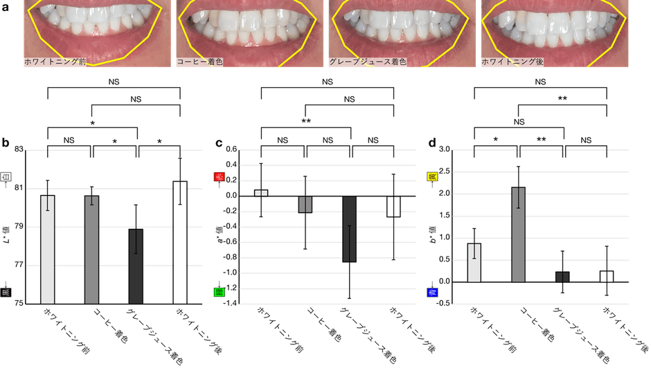 本研究グループは、歯の色の相対的な変化を評価するためのスマホカメラアプリを論文発表しました。アプリには環境光センサーと顔ランドマーク検出AI技術※が搭載されており、自撮りモードで前回撮影時と同じ明るさ、同じ口の開き方の画像を得ることができます。実験では、コーヒーやグレープジュースで歯に着色した後とジェルホワイトニング後にアプリで撮影を行いました(図1a)。画像中の歯の色を測定したところ、着色と漂白により相対的な色の変化を数値化できました(図1b-d)。また、人の目では違いに気付きにくいとされる微妙な変化(色差1.3)も撮影画像から確認できることが示されました。作成したアプリに既存の画像解析技術を組み込むことで、歯の色をスマホ一台で高精度に評価できる可能性を示す実験結果です。