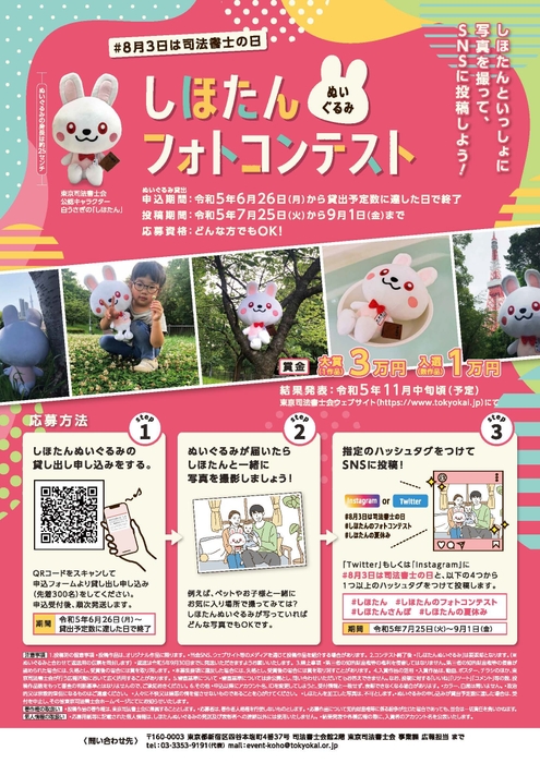 東京司法書士会は、令和5年度の司法書士の日記念事業として、Twitter、Instagramへの投稿による東京司法書士会公認キャラクター「しほたん」をテーマとしたフォトコンテストを開催いたします。