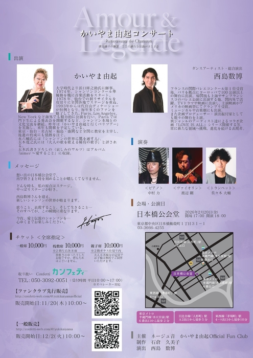 ネージュ音、かいやま由起Official Fun Club主催、『Amour & Legende かいやま由起コンサート』が2026年2月20日(金)に日本橋公会堂(東京都中央区日本橋蛎殻町1丁目31番1号 日本橋区民センター内)にて開催されます。 チケットはカンフェティ(運営:ロングランプランニング株式会社、東京都新宿区、代表取締役:榑松 大剛)にて発売中です。