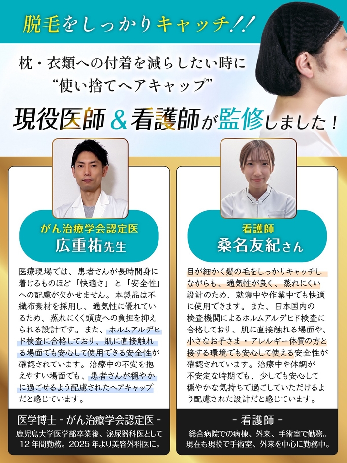 【新商品】抗がん剤治療中の「抜け毛の悩み」に寄り添う。現役医師×看護師W監修、敏感な頭皮を優しく包む「使い捨て不織布ヘアキャップ」を3月上旬より発売