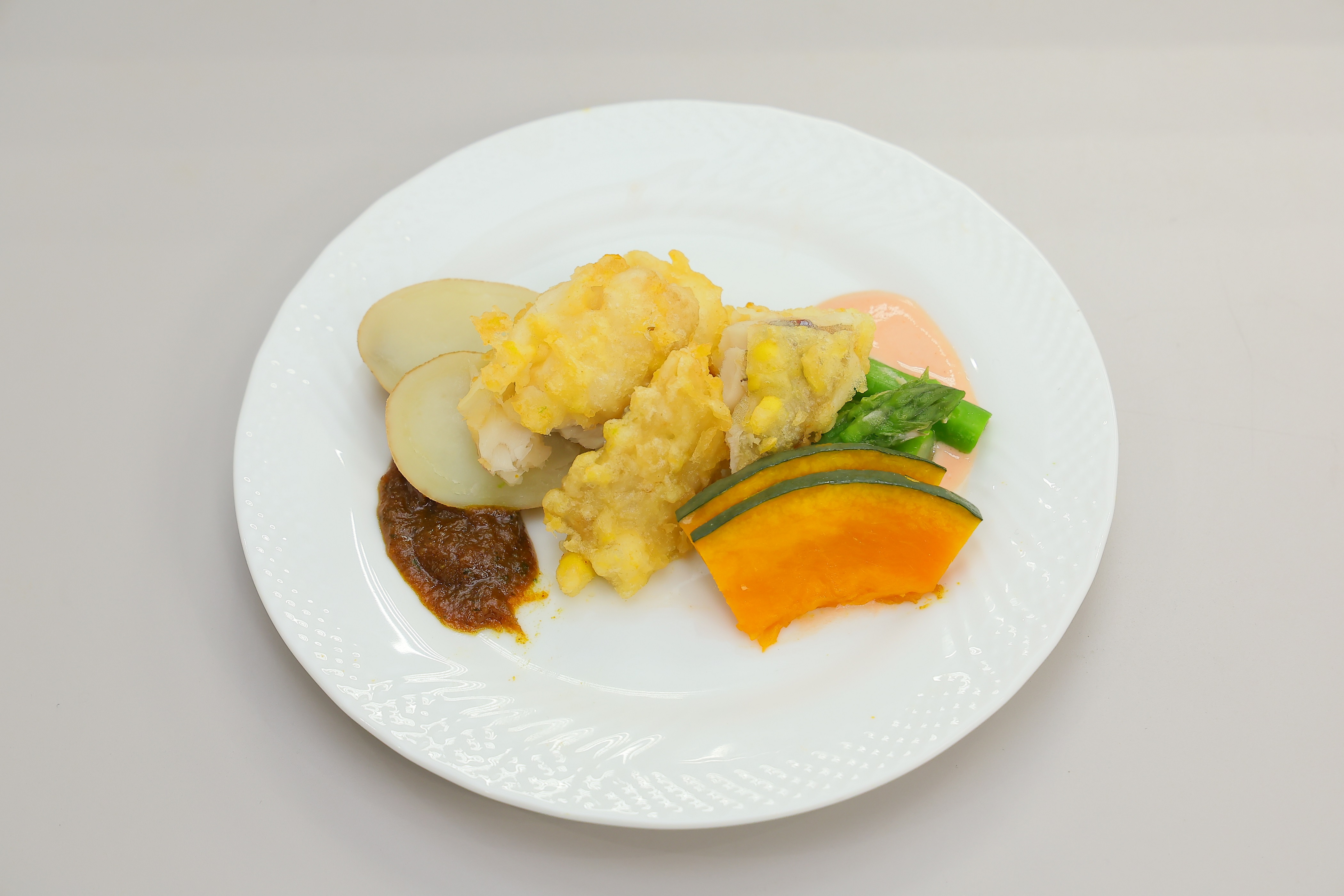 北海道の漁獲量が国内第1位である「鱈」をフリットにし、北海道産ヨーグルトを使用したオーロラソースと、味噌ベースのカレーソースの2種のソースで味わうメニュー。同じく生産量が国内第1位の北海道産かぼちゃの「くり将軍」の自然な甘さ、スイートコーンの粉を混ぜて揚げた鱈は絶品です。