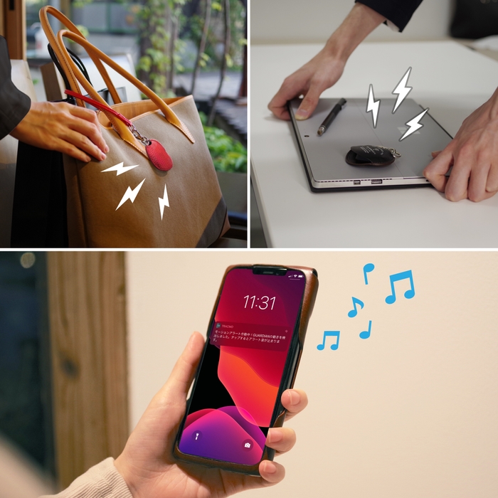 スマホと連携して大切なものを見守る、バッグアクセサリー。レザー製ストラップ付きカバーに、高性能なセキュリティタグが収められています。揺れや距離を感知し、スマホにお知らせ。GUARDIAN本体から警告音を鳴らすことも可能です。