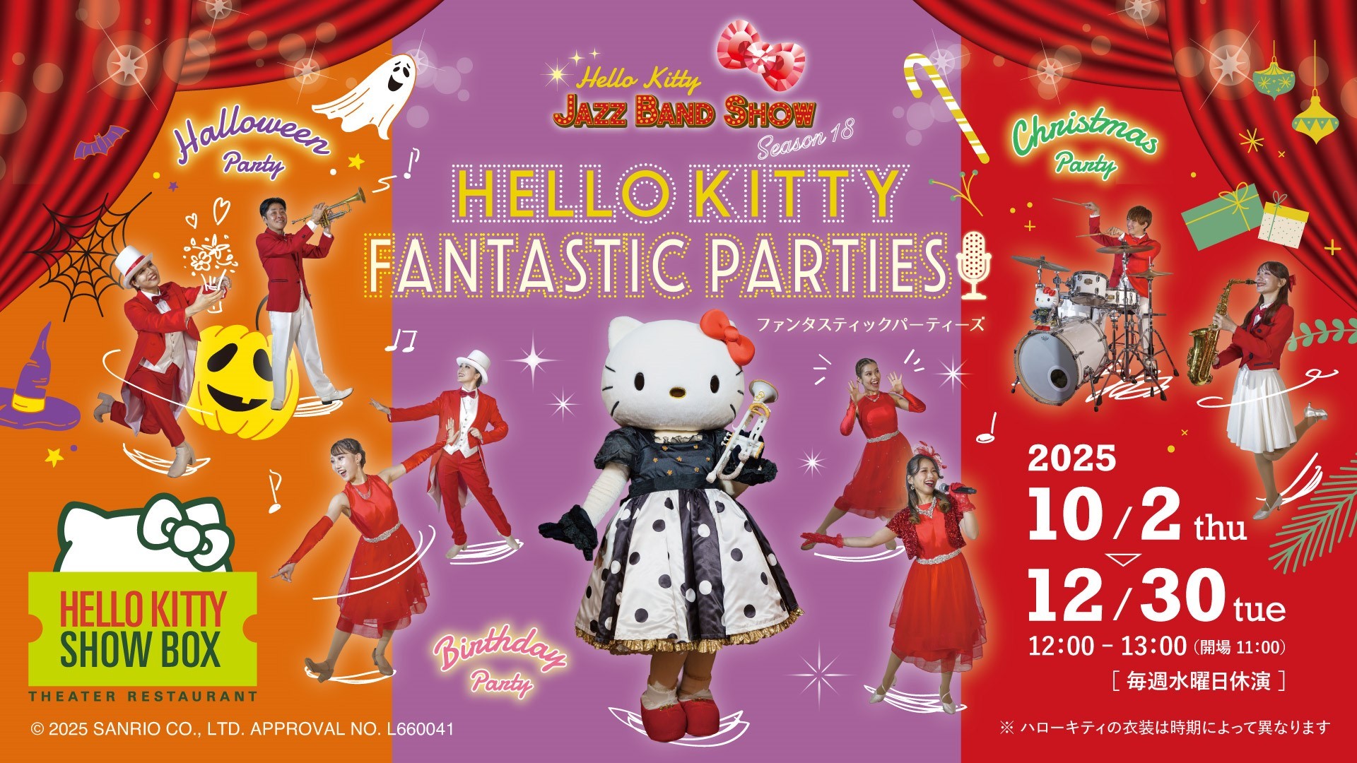ハローキティのショーと食事が楽しめるシアターレストラン「HELLO KITTY SHOW BOX」では、毎月テーマに沿って 変わるランチ公演「HELLO KITTY JAZZ BAND SHOW」がお届けする『Hello Kitty Fantastic Parties‼』を10月から12月末まで開催。そして11月公演『ハローキティのBirthday Party!』を11月1日(土)から 11月30日(日)に実施いたします。