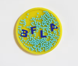 返礼品のために「日本タイポグラフィ年鑑2023ロゴタイプ・シンボルマーク 審査委員賞」受賞のデザイナー桑田知明(本学講師)が製作したコロコロ点字バッジは点字毎日にも掲載され、多くのクラウドファンディング支援者の中で人気沸騰です。表面に点字でBFLA(Barrier-Free College of Liberal Arts)、中には点字と同じ大きさのつぶつぶがたくさん入っていて、B・F・L・Aの文字とともにしゃらしゃらと動く、見て素敵、触って楽しい、聞いてたのしいオリジナルバッジ。今後色違いの製作も検討されています。