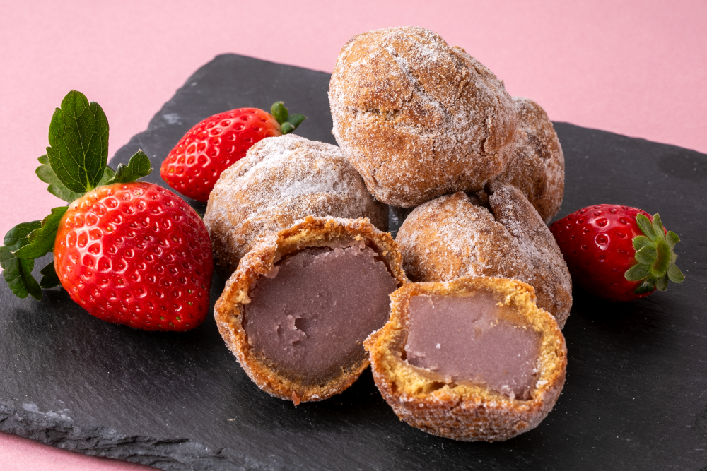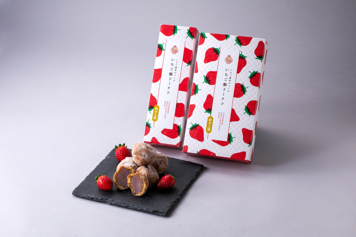 「いちごの餡ドーナツ」は、自社農園で栽培した完熟いちごを贅沢に使用し、果実の甘みと爽やかな酸味を活かして丁寧に炊き上げた特製いちご餡を、ふんわりと軽い食感のドーナツ生地で包み込んだオリジナル和菓子です。