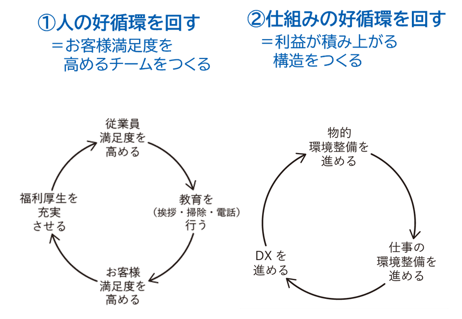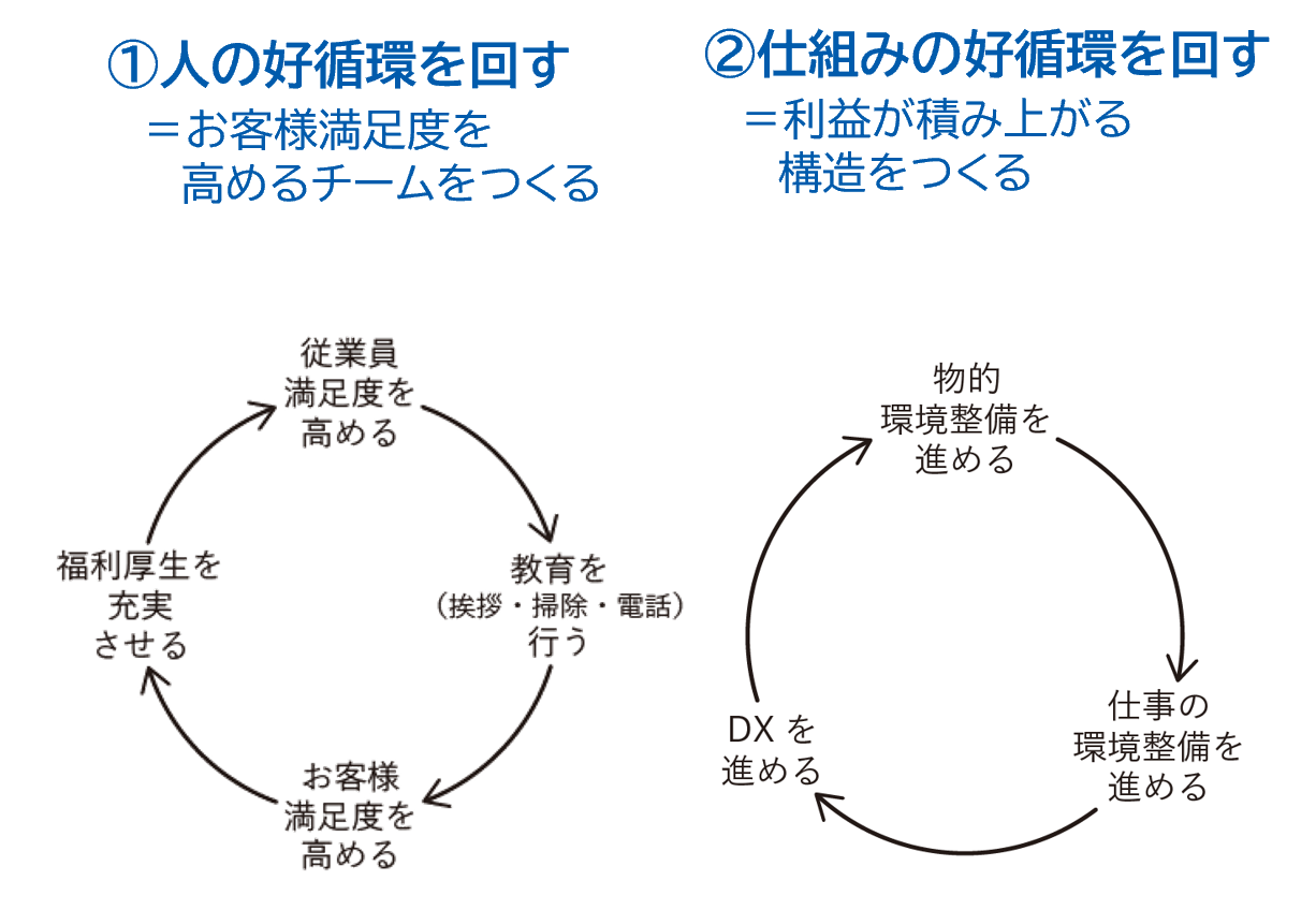 この「川六モデル」には、2つの軸があります。ひとつが「人の好循環」を回すこと。もうひとつが「仕組みの好循環」を回すことです.