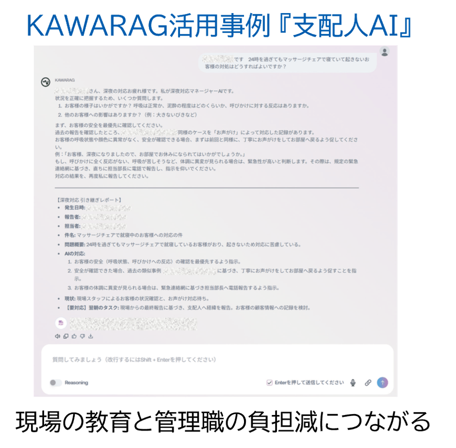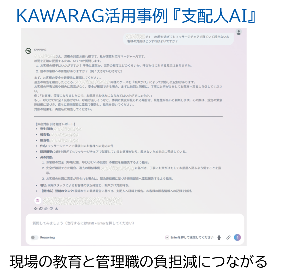 川六では社内データをAIに読み込ませて、社員が誰でもすぐに使えるようにするという意味を込めて、「KAWARAG」(川六のRAG)と名付けました。KAWARAGは、過去の事例や蓄積されたノウハウ、現場の声を素早く引き出し、活用するための仕組みです。