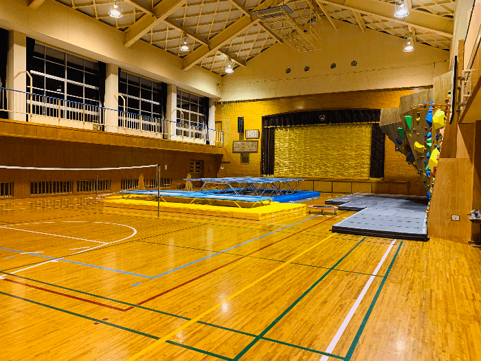 そう、ここは元小学校。体育館もうれしい施設に変身しました。スポーツ施設アリーナでは、ボルダリング、スラックライン、卓球やバドミントン、トランポリンなどを楽しむことができます。