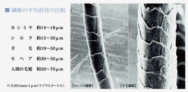カシミヤ繊維の平均直径は14μm(μmは1/1000ミリ)前後と、羊毛や他の動物繊維に比べて細いため、チクチクと皮膚を刺激しません。一番細い高級羊毛のジロンラムでも16μm、エクストラファインウールは19.5μm、メリノウールは23μm、アルパカは24〜31.5μm、モヘヤはもう少し太くて30〜50μmですので、その細さは毛素材で一番細いといえます。そして、羊毛に比べると伸縮率が40%以上も高いため、生地や製品になったときに、しなやかでとても柔らかい肌触りがうまれます。
