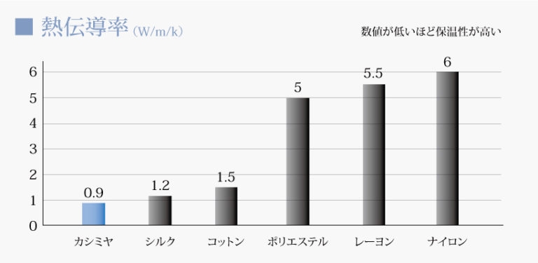 カシミヤ繊維は他の繊維より非常に細いという特徴をもっています。同じ太さの糸であっても、繊維が細ければ細いほど多くの繊維で束ねられた糸に仕上がります。クリンプ状で細いカシミヤ繊維は複雑によく絡み合うので、カシミヤの糸は、熱伝導率の低い空気をたくさん抱き込むことになります。カシミヤは繊維自体の熱伝導率も優れていますので、その糸を用いてつくられる生地は、外気を遮断し、放熱を抑えるという、二重サッシ窓の様な役割を果たしてくれます。熱伝導率が低い空気を、たくさん取り込むことのできるカシミヤ製品は、軽くて保温/保湿にも優れています。