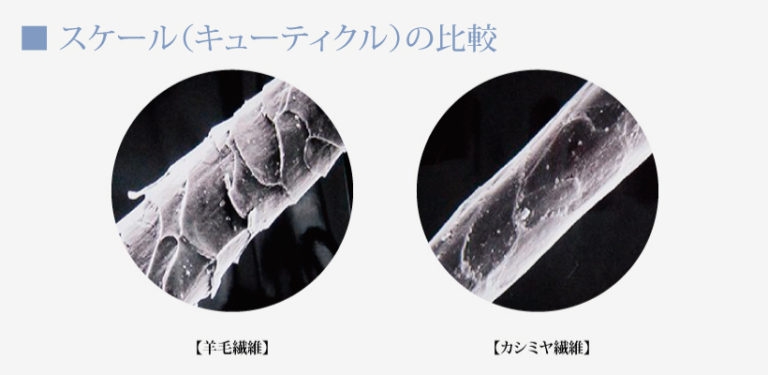 繊維表面は鱗状のスケール(キューティクル)で覆われています。羊毛繊維のスケール形状は、カシミヤより複雑で数も多く凹凸なのに対して、カシミヤ繊維は数が少なく滑らか。動物繊維の中でも特に綺麗なスケール形状を保持しています。スケールが多く突起が大きいと皮膚刺激の原因になります。