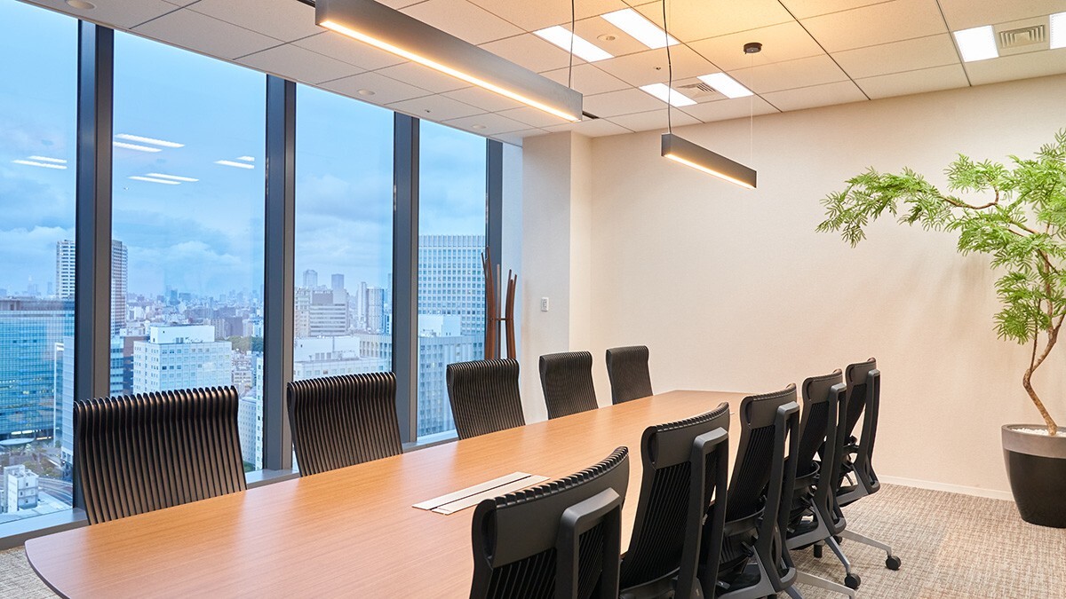 都会の街並みを一望できる開放感あふれる空間で、明るく落ち着いた雰囲気が特徴です。長い木製テーブルとシンプルな黒のチェアが並び、洗練されたデザインながらも機能性を重視。観葉植物も配置されており、リラックス感と自然の温かみをプラスしています。会議や打ち合わせに適した、上質で快適なミーティングスペースです。