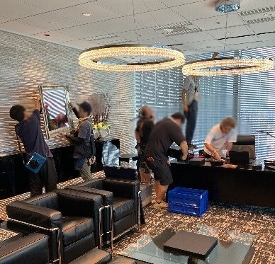 今回の撮影は2日間行われ、撮影で使用された部屋以外は控え室や機材置き場として提供させていただきました。撮影前は沢山のスタッフの方々により、手際よく小道具などが並べられ、あっという間に撮影のセットが出来上がりました。