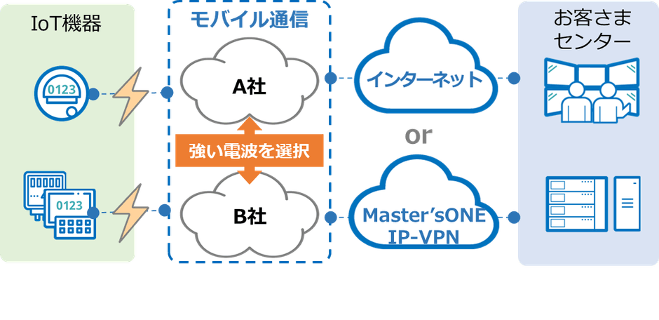 端末数の多いIoT事業では、各設置場所でどの通信キャリアが利用できるかを確認するのは非常に手間がかかります。本サービスを活用することで電波環境が変わっても継続して安定した通信を行うことができ、また通信事業者の工事や障害が発生した場合でも、別の通信キャリアの電波に切り替えて利用することができるため通信断の発生頻度を低減できます。