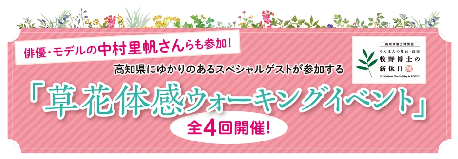 今回、博覧会関連イベントとして、牧野博士ゆかりの地などを、高知県にゆかりのあるスペシャルゲストと一緒に歩く「草花体感ウォーキングイベント」を、2月から5月にかけて全4回実施します。