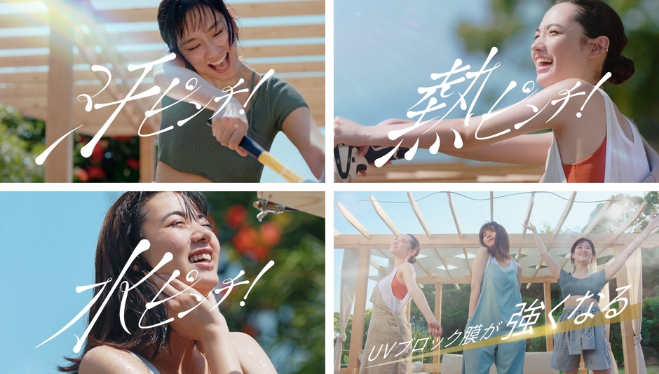 プロモーションの象徴となる「DIY」篇では、日常の中の過酷な日差しを描きながら、アネッサの金ミルクで肌を守る重要性を伝えています。モデルたちは夏の昼間にテラスで格子状のパーゴラ(日陰だな)づくりに楽しく挑戦しますが、肌にとっては過酷な状況でもあります。太陽の熱を大量に浴び、汗をかき、水をも浴びてしまう。そんな過酷な条件が見事にそろったのが「DIY」篇です。過酷な状況をさらに感じてもらうために、それぞれのモデルの表情が出やすい瞬間をとらえました。ニコラさんは熱い屋根の上でドリルを回す瞬間、水川さんは釘をハンマーで力いっぱい打つ瞬間、エライザさんはミストシャワーの水を思いっきり浴びてしまう瞬間、どれも過酷な状況を強調しています。
