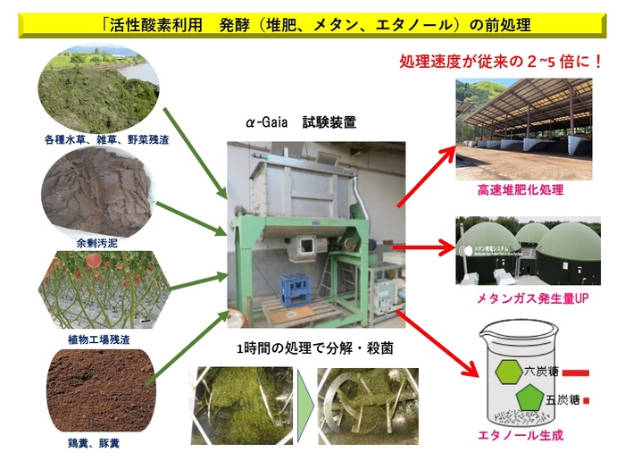 活性酸素は強固な細胞壁(膜)が常温で瞬時に分解できるので、今後は今回のように完全分解までもっていくだけではなく、細胞膜分解することで圧倒的に効率が上がる、メタン発酵、堆肥化、エタノール抽出、微細藻の脂質抽出などの分野で利用していきたいと考えている。