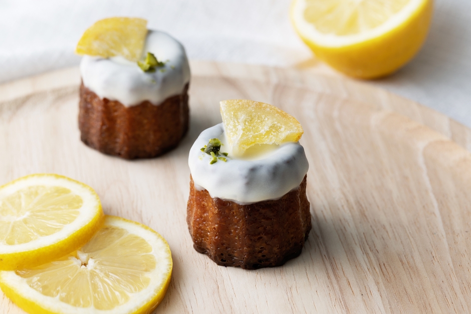 紅茶風味のカヌレに甘酸っぱいレモンチョコをデコレーションしドライレモンをトッピングした、見た目も夏らしい香り豊かなカヌレです。