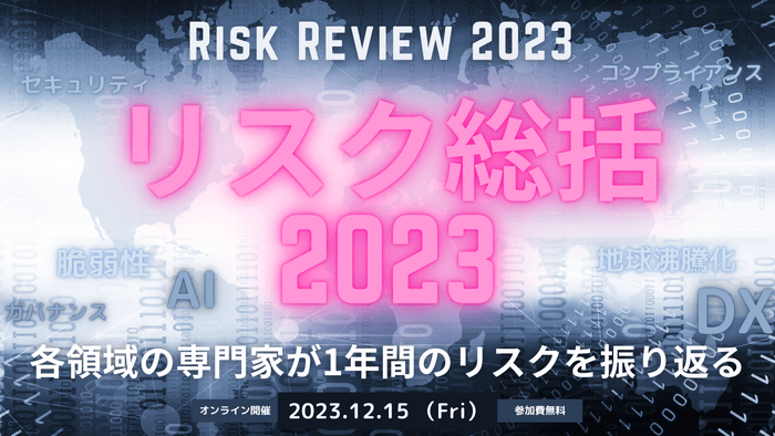 リスクマネジメントとBCPの専門メディアであるリスク対策.comは12月15日(金)、今年起きたリスク事象への対応を振り返り、危機管理やリスクマネジメントの見直しのポイントを解説するオンラインセミナー「リスク総括2023」を開催します。