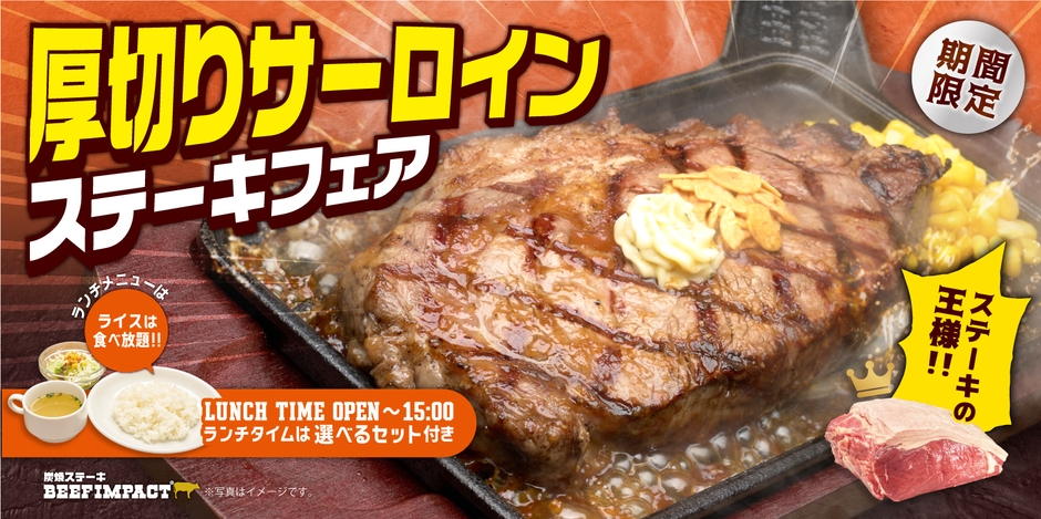 炭焼ステーキの専門店「ビーフインパクト」が10月1日から 「厚切りサーロインステーキフェア」を北海道・千葉の全店舗で開始