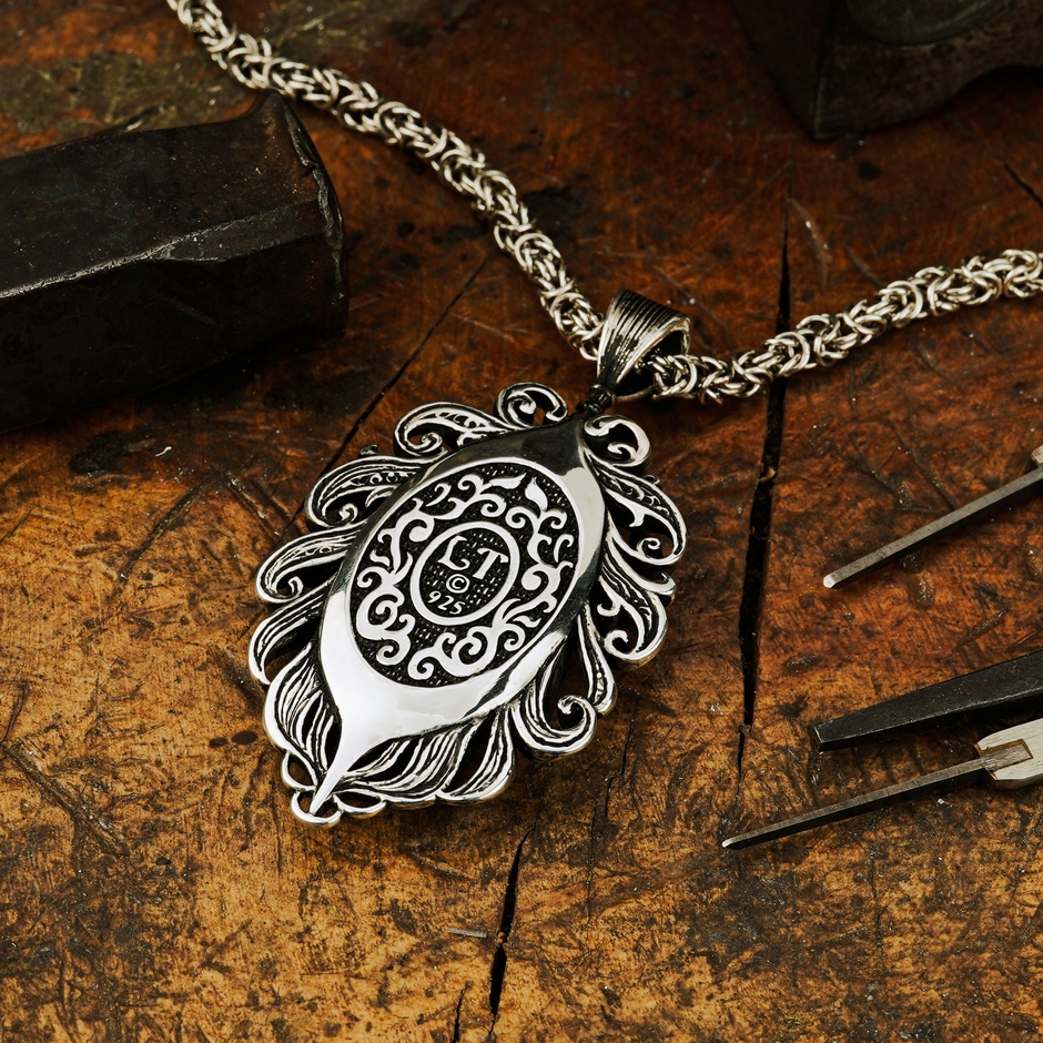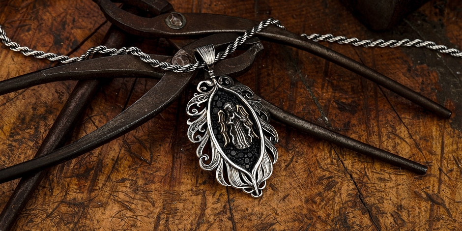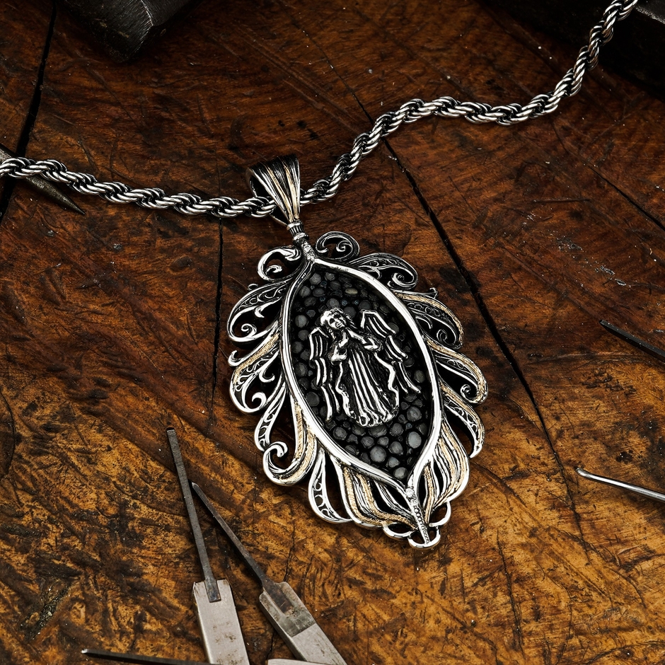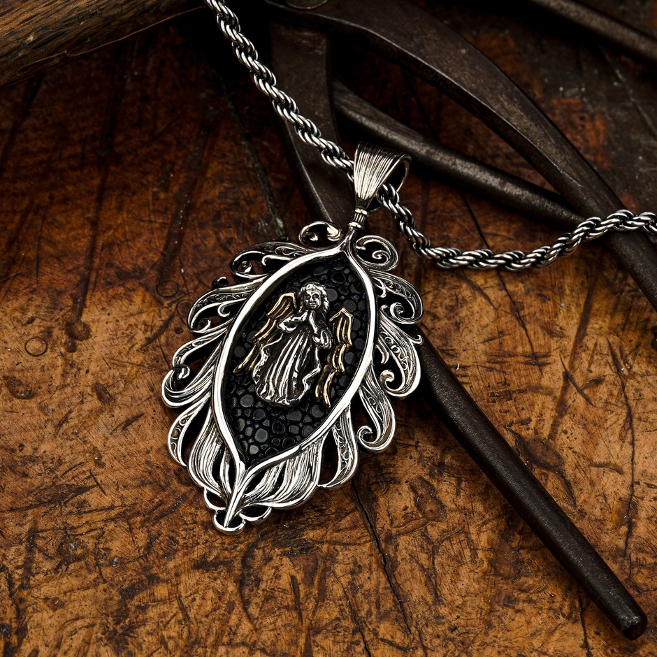 天使から舞い降りた羽根に抱擁される姿を表現した繊細さと優雅さを併せ持つアイテムとして制作されたペンダント。中央には祈りを捧げる天使の姿がデザインされており、着用するものに神のご加護が訪れますようにという願いが込められている。
