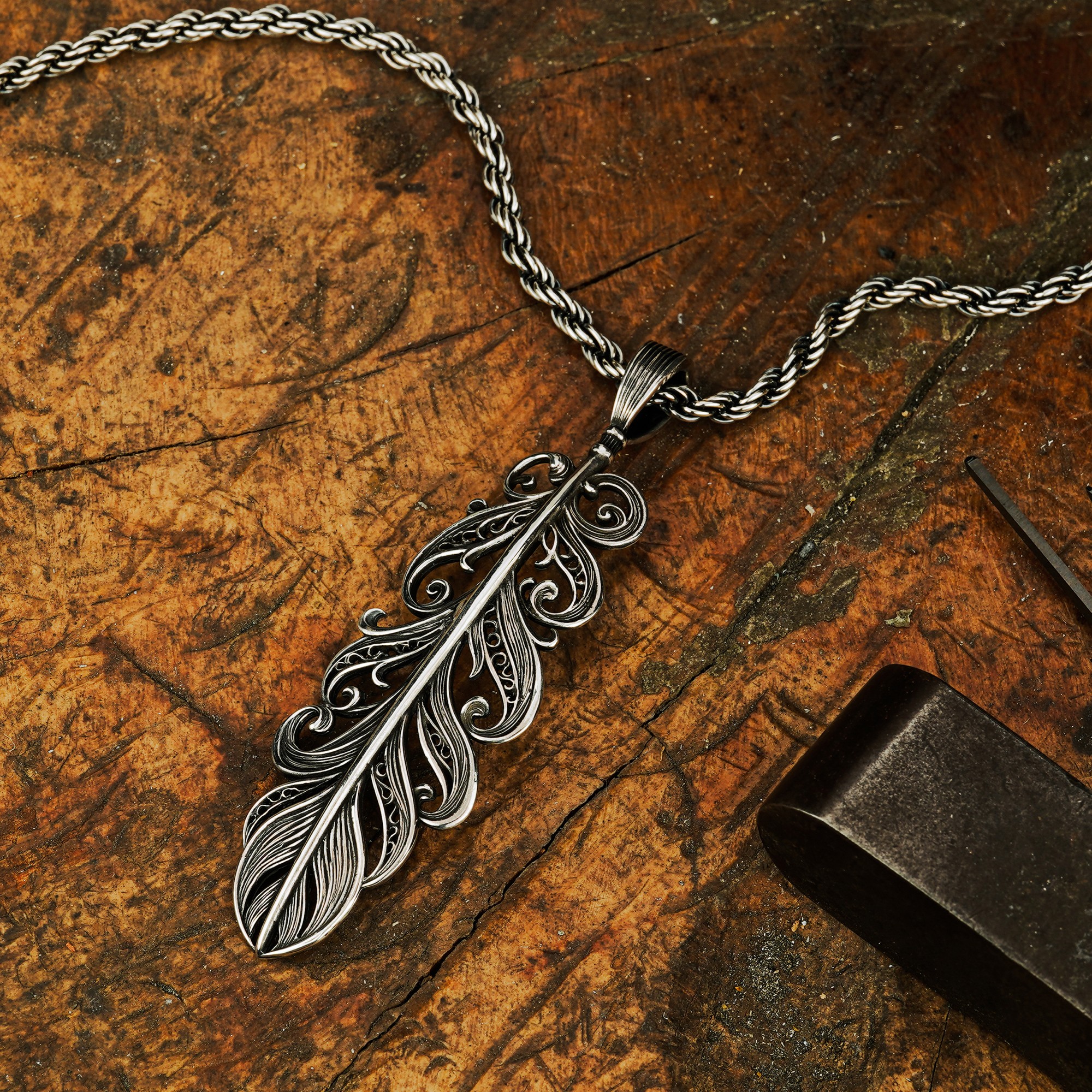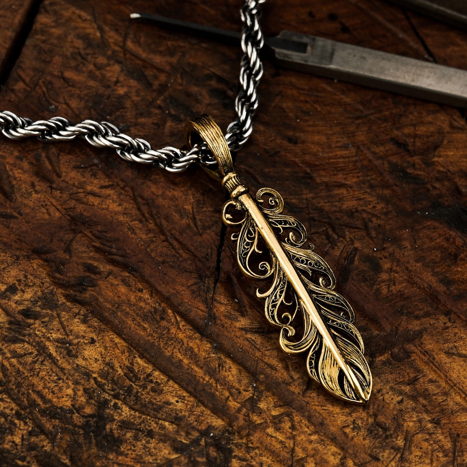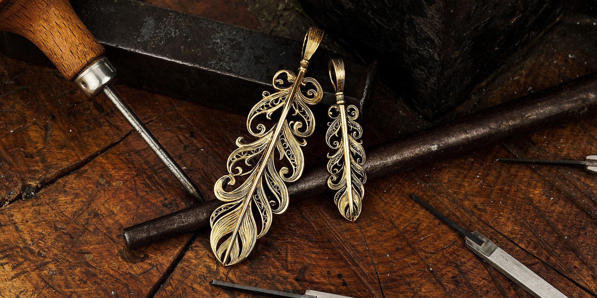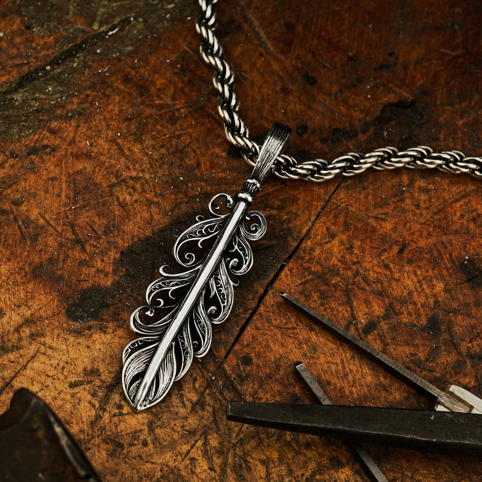 羽根を透かし彫りのシルエットを用いて表現。中世ヨーロッパの装飾を想わせるようなスクロール柄を取り入れたペンダント。天使が羽ばたいた際に軽やかに舞う羽根をイメージし、空を優雅に漂いながら舞い降りてく雰囲気に仕上げられている。