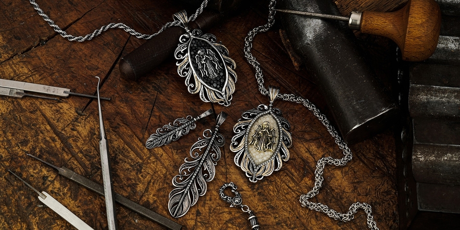 本年の新作は、昨年末に発売されたガーディアンエンジェルに続き天使にまつわるアイテムを発表する。空を舞う天使の羽根をかたちにしたスクロールフェザーペンダントや、包み込まれる柔らかな天使の羽根から着想を得たエンブレイスフェザーペンダント、祈りを捧げる天使"ガーディアンエンジェル"のインレイパーツが新たに制作される。他にもイベント限定モチーフやカスタムが施された作品など、普段では目にすることのない希少なアイテムが多数勢揃いする。インストアイベント当日は向條氏へのカスタム相談や、エングレイビングサービス(手彫り刻印入れ)など、様々な特典を設けたイベントとなっている。
