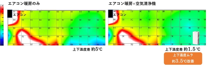 アプリ内(Daikin Smart APP)でエアコンと空気清浄機の連動を設定した後、エアコン暖房を開始すると、空気清浄機が連動運転し、サーキュレーター効果で、足元付近の冷たい空気を撹拌するなど、ワイドリビングの暖房時の上下温度ムラを軽減します。設定温度到達時に室内の上下の温度ムラが、エアコン連動ありの場合は、約3.5℃改善※8します。