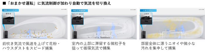 また、室内の空気中に浮遊する花粉やハウスダスト、PM2.5などの粒子の大きさを高感度センサーで判別し、大きさに合わせて気流を自動的に制御する風向自動を併用した「おまかせ運転」や、用途に合わせて選べる「パワフル花粉」「浮遊飛沫」モードも新たに搭載しています。