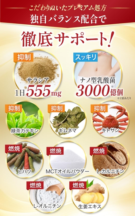 主成分:サラシア16650mg、ナノ型乳酸菌3000億個、9種サポート成分