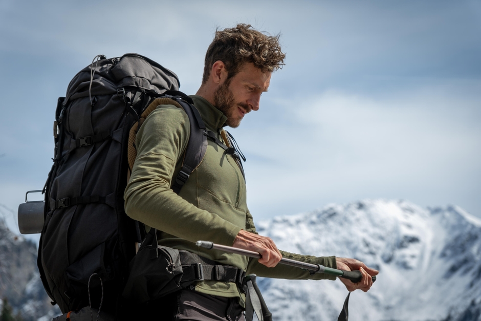 山岳環境での冷気から身体をしっかりと守るために、メリノウール混の厚手タイツを新たに開発しました。2種類のメリノ生地を組み合わせることで、体温調整に優れた快適な着用感を実現し、さらに機能的なファスナーを備えることで利便性も高めています。
