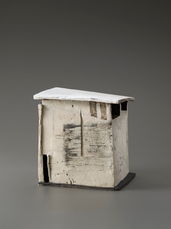 その後1960年代から1970年代にかけて、より純粋な抽象形体へと制作をすすめていきますが、作品には少しずつ釉薬や白化粧などが施され、ある種の絵画性を帯びていきます。そして1980年代初め頃から、見る者の錯視(さくし)を誘う魅惑的な立体へと展開し、二次元(平面)と三次元(立体)が複雑に交錯する、極めて独創的な作品が制作されました。それは飛行兵として体験した夜間飛行の錯視経験に基づくものでした。