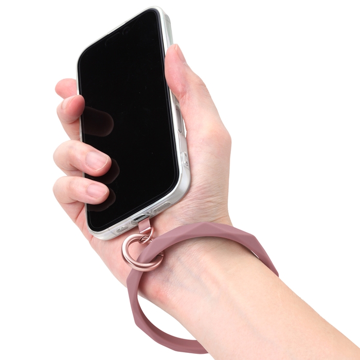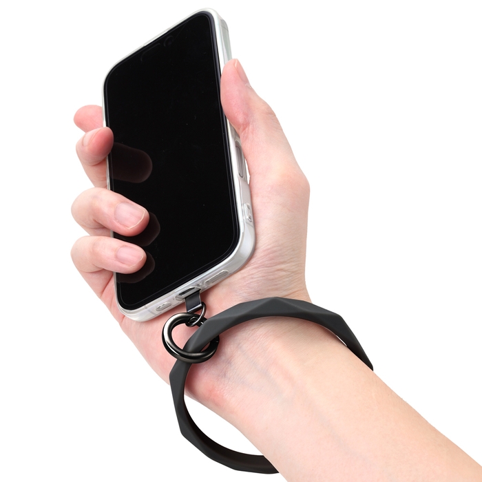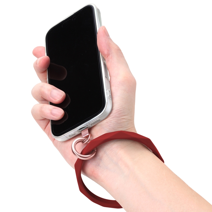 しなやかなシリコン素材のハンドストラップで手首や腕から提げて持ち歩ける為、両手がふさがずスマートフォンの操作ができ、落下防止にも役立ちます。