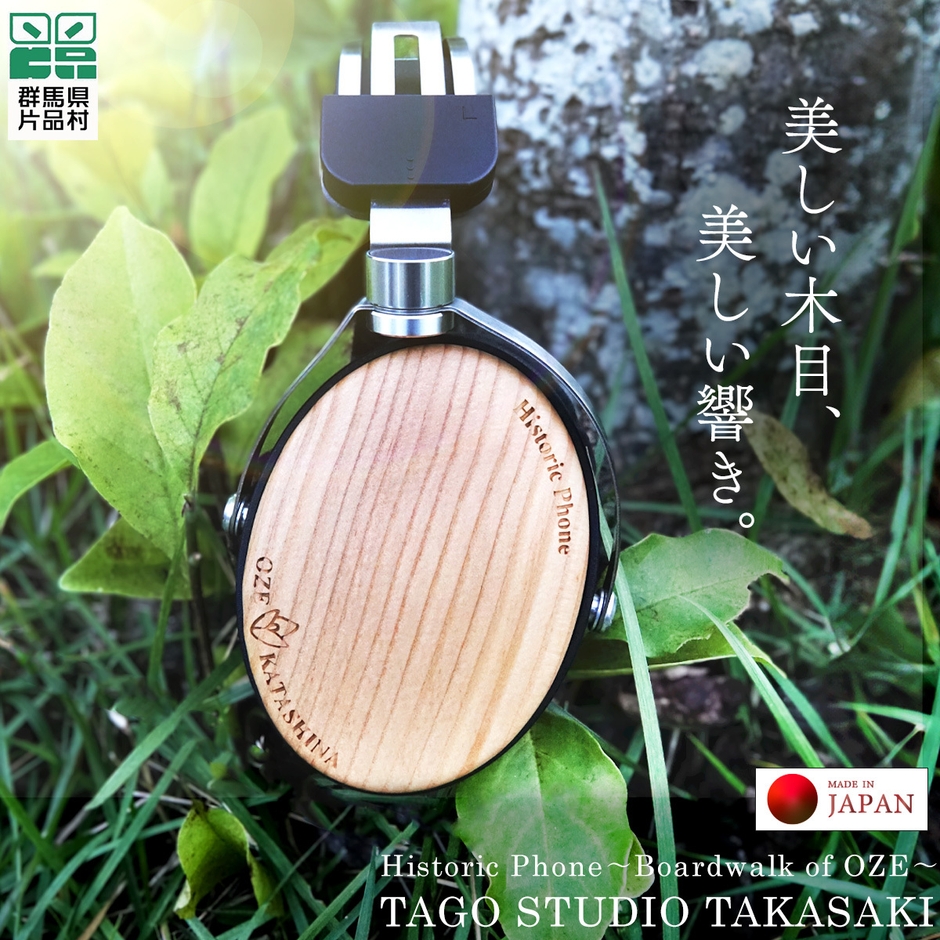 そんななか、作曲家・音楽プロデューサーとして数多くのアーティストに楽曲を提供している多胡 邦夫氏が代表取締役を務めるTAGO STUDIOより持続可能な社会への取り組みの一環として、木材の廃材を再利用するヘッドホン『Historic Phone』シリーズというものがあり、尾瀬の木道材でヘッドホンを試作したので当村の振興にお役立てできないかとご提案をいただき、試作品をベースに片品村限定仕様の「Historic Phone ~Boardwalk of OZE~」を作成するに至りました。