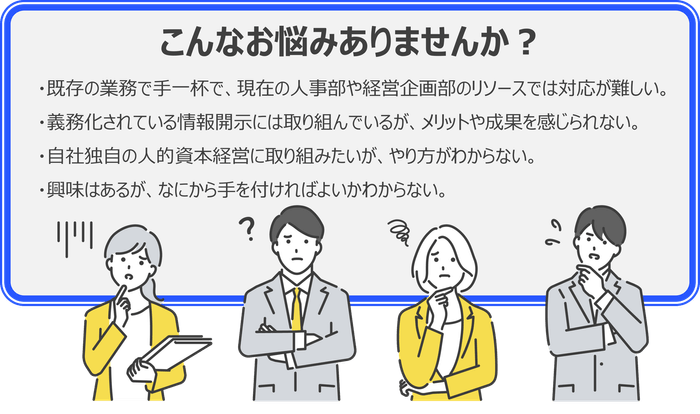 2023年3月期に、有価証券報告書に人的資本項目の開示が義務付けられ、人的資本経営を推進する潮流が企業経営に影響を及ぼしています。ジョブ型雇用への制度改正や自律的キャリア形成など、新しい形のマネジメントが求められ、皆様の企業でも、議論や検討が進んでいるのではないでしょうか。そのような背景のなか、社内リソースに課題がある、情報開示の効果が感じられない、などお悩みの方も多くいらっしゃいます。