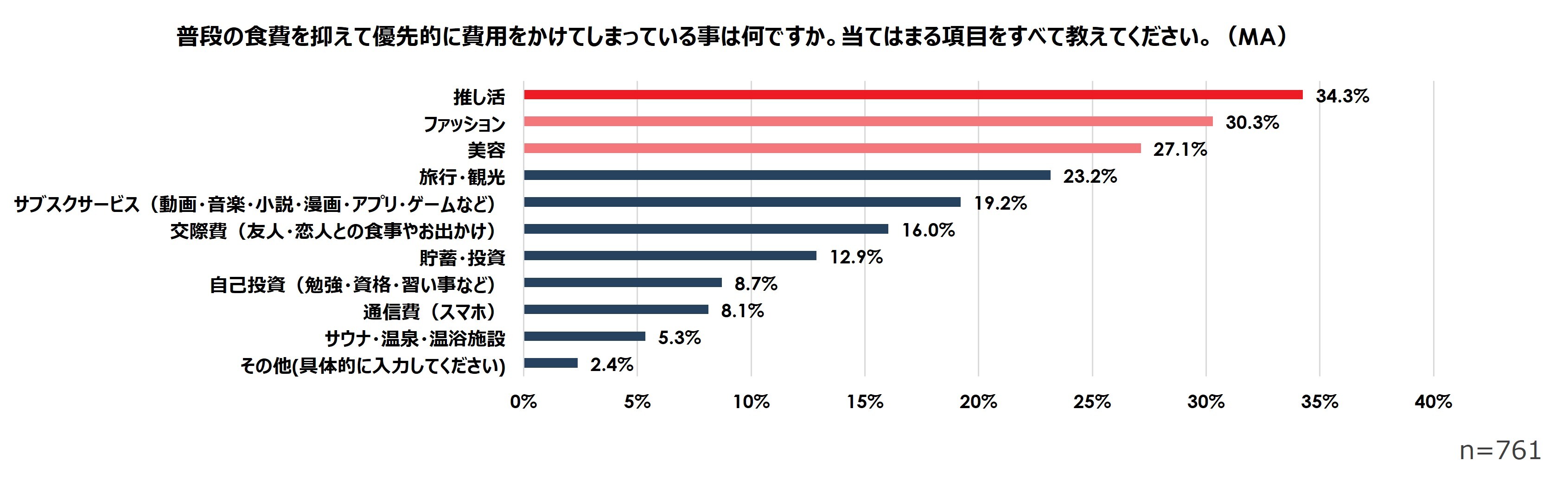 約7割(66.4%)の人が普段の食事を節約してメンブレ回避にお金を使っています。優先的に費用をかけてしまうことのトップは、“推し”を応援することで活力をつける「推し活」(34.3%)であり、続いて「ファッション(30.3%)」、「美容(27.1%)」が上位に並びました。