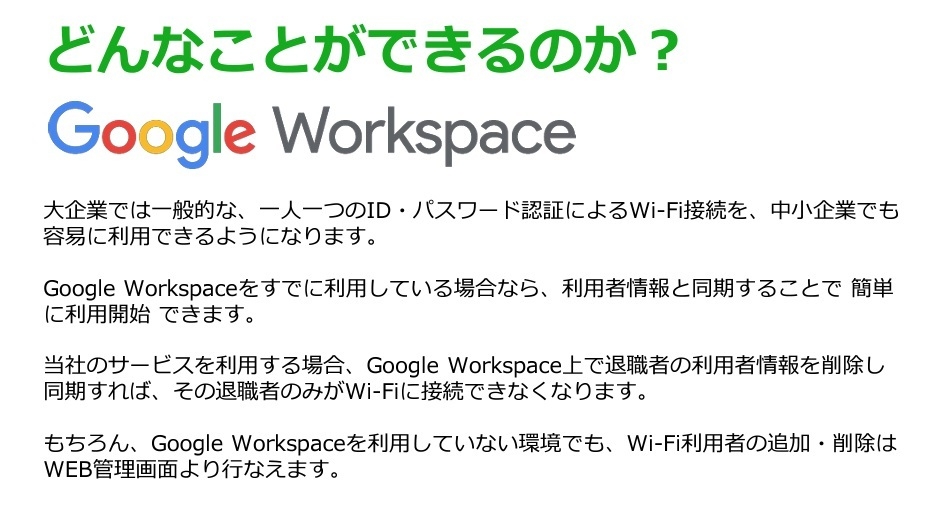 【各自のGoogle Workspace ID/PassでWifi接続 for クラウドWi-Fi認証サーバーの特長】