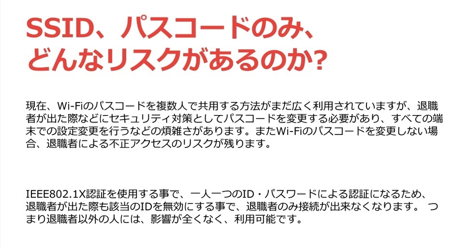 ●大企業では一般的な、一人一つのID・パスワード認証によるWi-Fi接続を、中小企業でも容易に利用可能。