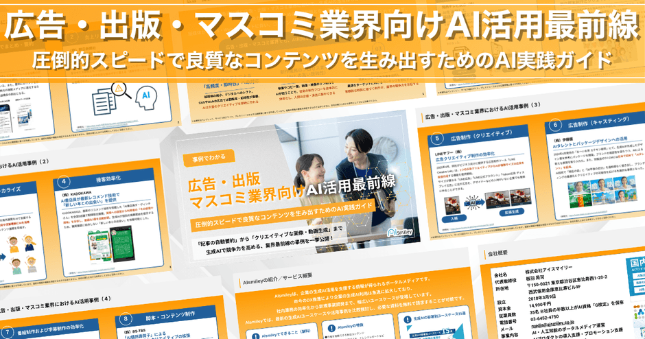 国内最大級のAIポータルメディア「AIsmiley」を運営する株式会社アイスマイリー(東京都渋谷区、代表取締役:板羽 晃司)は、広告・出版・マスコミ業界における最新の生成AIユースケースをまとめた「広告・出版・マスコミ業界向けAI活用最前線」を、2026年3月24日(火)に公開しました。