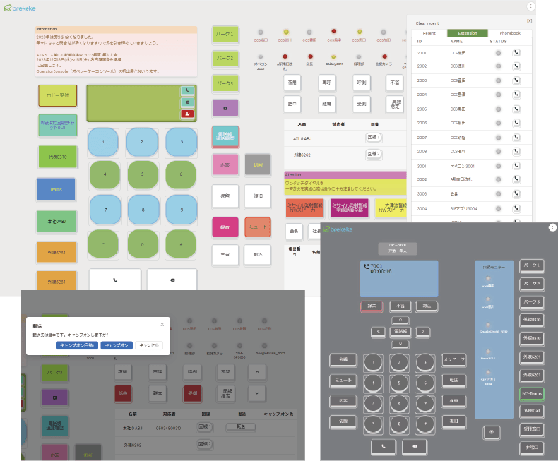 株式会社日本ブレケケ(本社:埼玉県川越市、代表取締役:山出 晋)は、多機能電話機をWEBブラウザ上で再現するWebRTC電話機『オペレーターコンソール』を2023年12月12日より提供開始します。これまでPBXメーカーの専用機で提供されてきた、キャンプオン、シェアードラインキーといった多機能電話特有の機能をWEBアプリ上に再現し、更に各機能ボタンの色、配置、追加、削除を自由にデザインできるため、利用シーンに合わせたオリジナル電話機の作成が可能となりました。