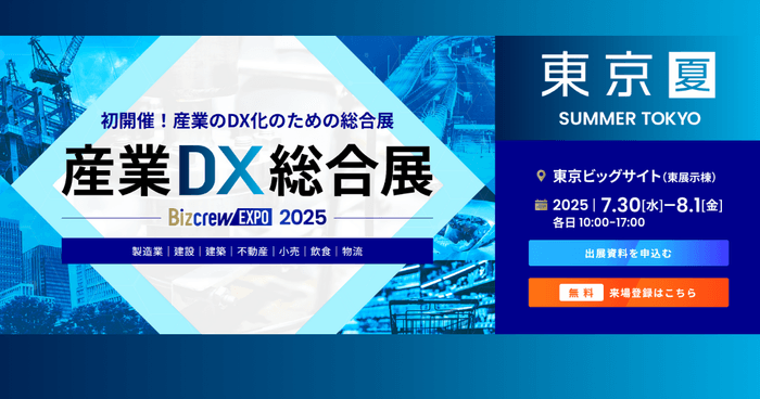「産業DX総合展 2025 夏 [東京] 」は、製造業、建設、建築、不動産、小売、飲食店、物流など産業のDX化を実現するサービス・ソリューションが一堂に集う総合展です。