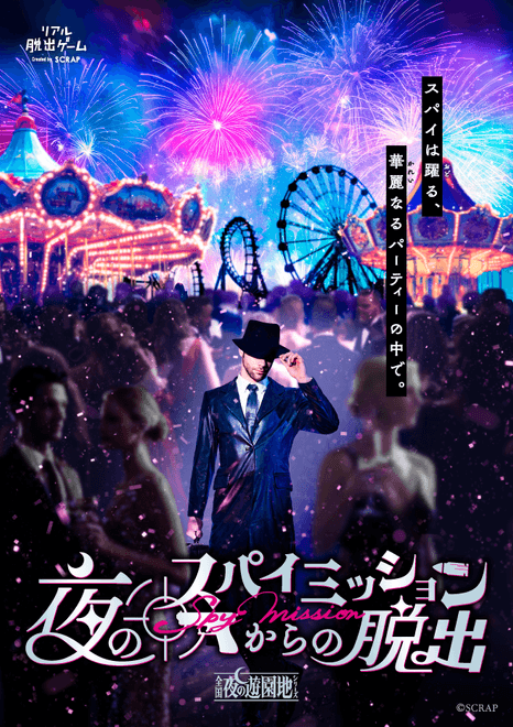 今作の舞台は、豪華絢爛な秘密のパーティー。その裏で行なわれる極秘の薬品取り引きを阻止するため、プレイヤーはスパイとなり、パーティー会場に潜入します。スパイ道具を駆使して謎や暗号を解き明かし、ときには敵を欺きながらミッションに挑戦。閉園後の遊園地を貸し切った特別な空間で、1,000人以上が同時に参加するリアル脱出ゲームは、唯一無二の体験となっています。
