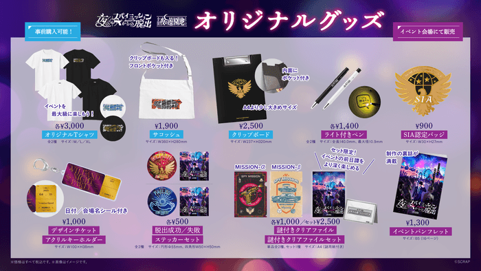 全世界で累計1,490万人以上を動員しているリアル脱出ゲームを企画制作する株式会社SCRAP(本社:東京都渋谷区、代表:加藤隆生)は、2025年4月11日(金)の東京会場を皮切りに全国で開催する「全国夜の遊園地シリーズ」最新作『夜のスパイミッションからの脱出』のオリジナルグッズを発表いたします。