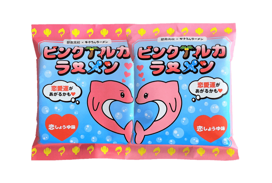 ピンクイルカは幸運のシンボルと言われております。1日に3回見ることができれば幸せになれるという話もあります。本品のパッケージではピンクイルカラーメンが表1匹と、裏2匹いるので、合計で3匹を見つけることができます!