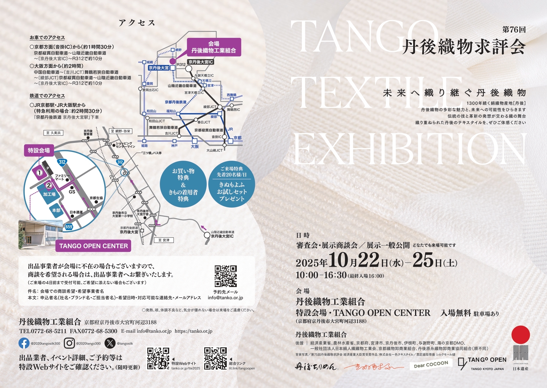 丹後織物工業組合(所在地:京都府京丹後市)は、『TANGO TEXTILE EXHIBITION/第76回丹後織物求評会』を2025年10月22日(水)から10月25日(土)まで丹後織物工業組合特設会場及びTANGO OPEN CENTERにて開催いたします。