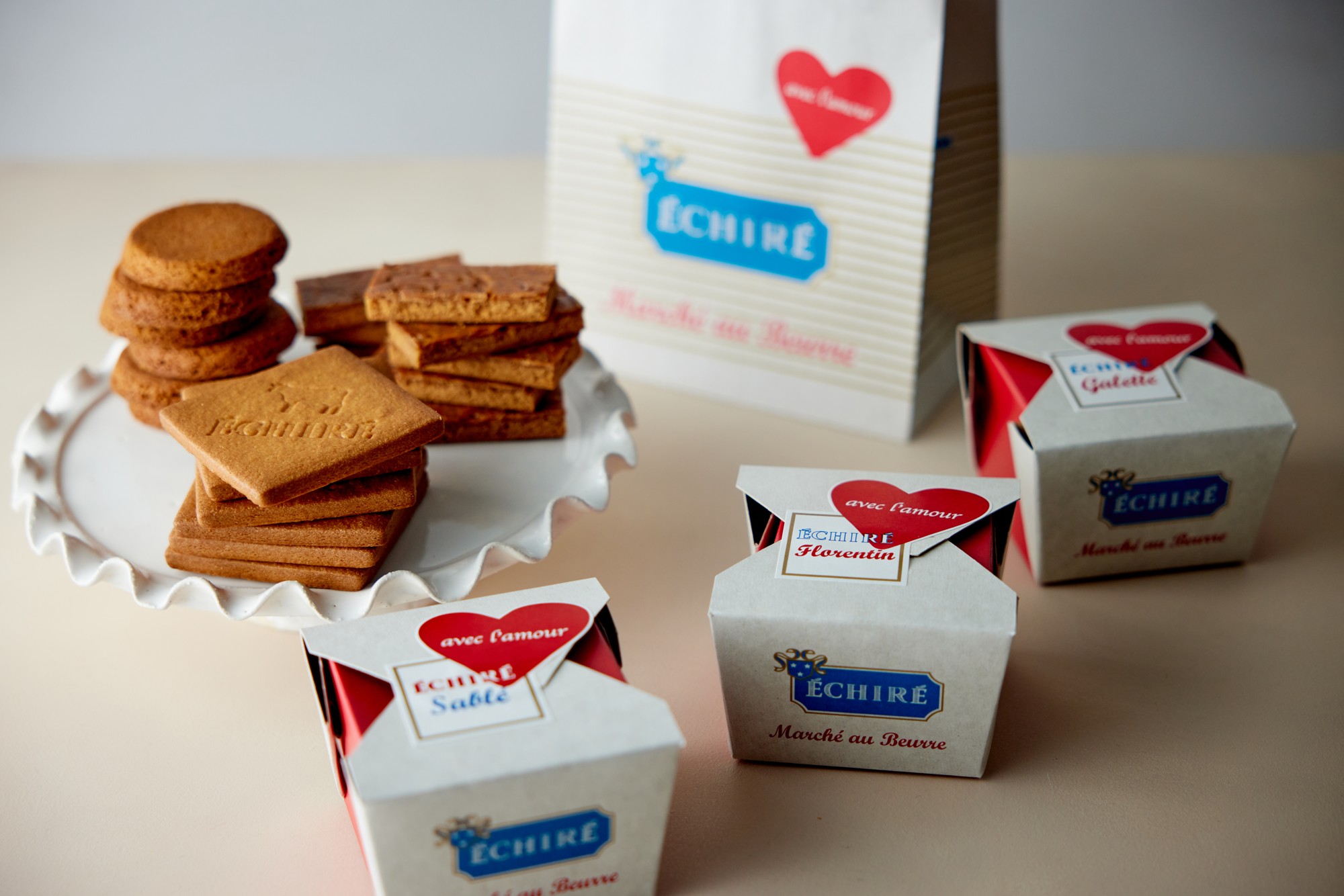 バレンタイン&ホワイトデー期間には、人気の「サブレ・エシレ 6枚入」「ガレット・エシレ 6枚入」「フロランタン 8枚入」を、赤いハートのモチーフに“avec l’amour”のメッセージをそえた限定デザインのボックスでご用意。また、ショッパーにも同様のデザインを施しました。