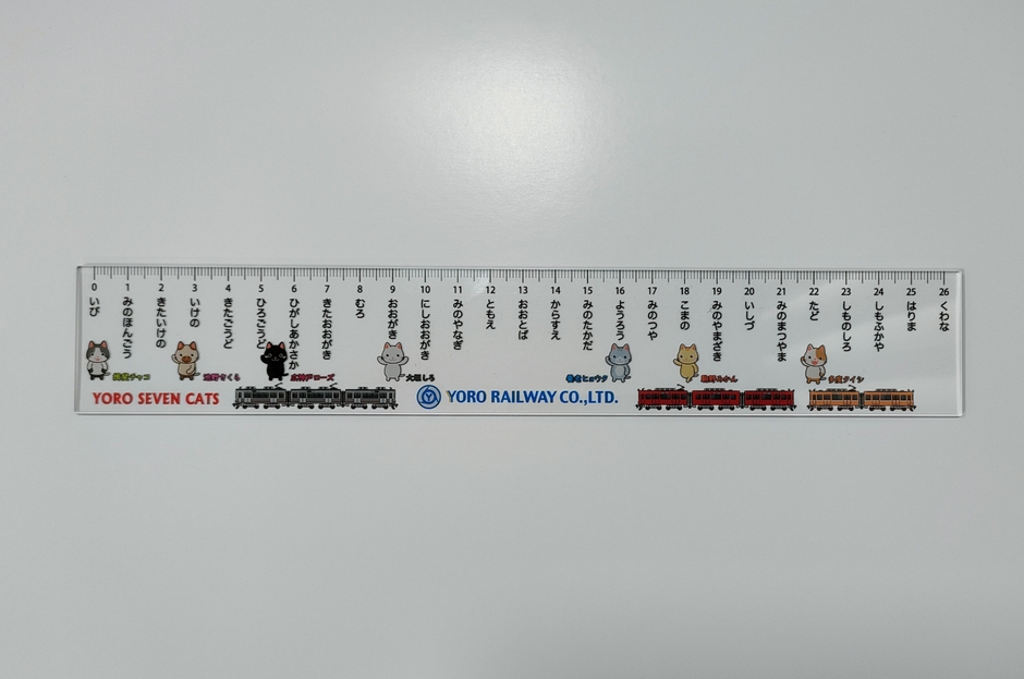 6.内容 透明のアクリル26cm定規をベースに、目盛部分には、養老線の全27駅をひらがなで表示し、電車のイラストや、オリジナルキャラクター「YORO SEVEN CATS」とともにデザインしました。