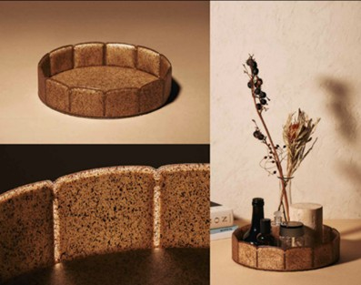 透明塩ビに独自の製法で乾燥&粉砕した青森県産りんごの搾り粕を混合し、独特な風合いを持つ塩ビシートを作成。シートをウェルダー加工することで小物収納に便利なインテリアアイテムを作成しました。本来は廃棄されるはずだったリンゴの搾り粕は、リンゴの皮や芯、ヘタ、種などが高いデザイン性の表現を与えています(リンゴ部位の差→風合いに変化)。また、搾り粕に含まれる糖や成分が熱と反応して生まれる赤褐色は、収穫の年や果実の状態によって微妙に異なり、同じものはひとつとしてないとか。
